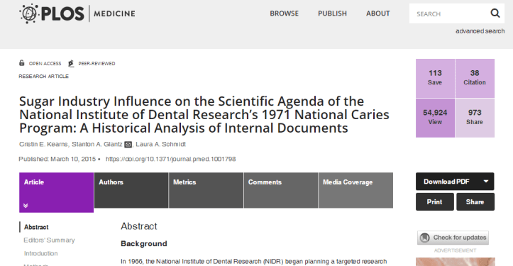 2015: la revista PLOS Medicine publica un largo artículo que demuestra que la industria del azúcar manipuló investigaciones sobre la caries en EE.UU. Se basa en 319 documentos de la industria de los 60 a los 70 encontrados en una biblioteca de la Universidad de Illinois.