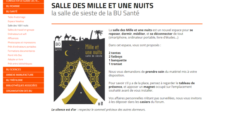 Fuera de bromas, el BBF nos cuenta que la biblioteca de la Facultad de Salud de la Universidad Jean Monnet (en Saint-Etienne, próxima a Lyon) pone en práctica sus propias convicciones sobre la bondad de una siesta reparadora.